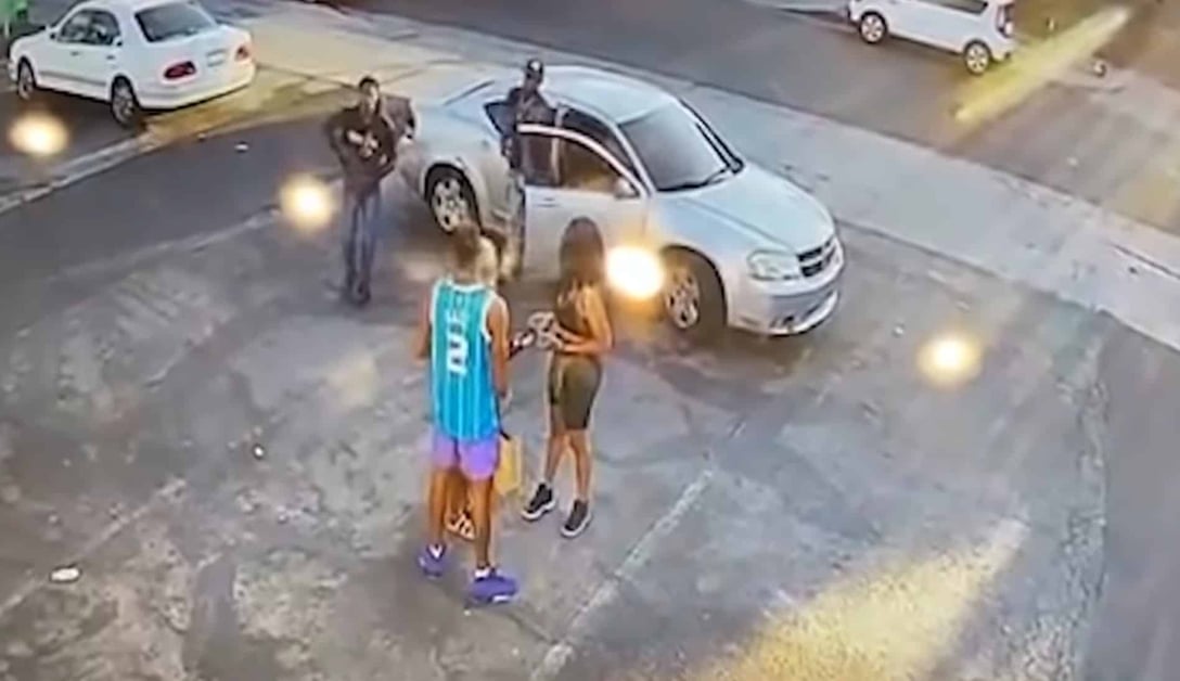 A vehicle backed up to where the man and two women were standing in a parking lot, apparently after a little shopping. Two people get out of the car, one with a visible gun. The defender drops the things in his hands and quickly draws and fires, sending all suspects fleeing.