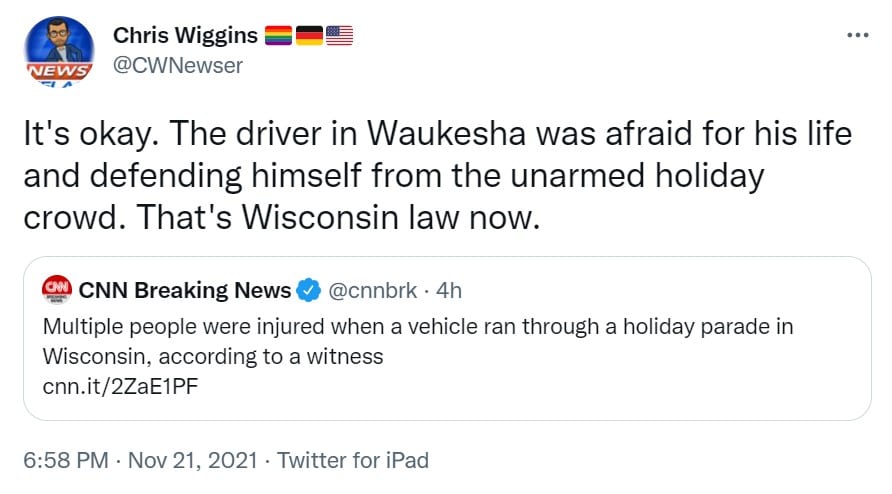 In what might be soon classified as an act of domestic terrorism, the terrible incident in Wisconsin where an SUV plowed into a parade, killing multiple people and injuring over 2 dozen, a reporter by the name of Chris Wiggins took to Twitter and attempted to vent his frustration at the outcome of the Kyle Rittenhouse trial.