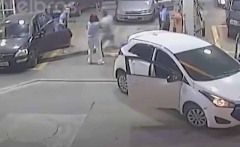 The sum of this story is as follows: An argument was going on at a gas station between some people and an off-duty officer, when a woman and man get out of their vehicle and confront the off-duty officer. The woman approaches first, and the man follows. Quickly. He tries to deploy a flying kick, but the off-duty officer shoots twice, killing the man.