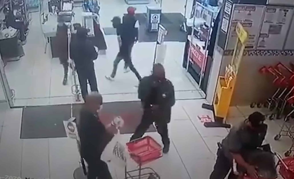 Two armed guards are transferring some cash bags when they find themselves ambushed by two armed men at the entrance to the store. One guard gets a feeling that something is up and seems to have a heads up, but ends up dropping his gun in an attempt to surrender as soon as one of the bad guys points a gun at him.