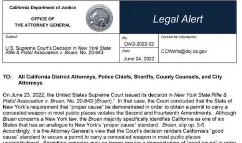 As a direct result of the Supreme Court decision this week in New York, where they threw out the requirement to show “proper cause” when issuing a concealed carry permit, the California Attorney General has stated that “effective immediately, issuing authorities should no longer require proof of good cause for the issuance of a public-carry license.”