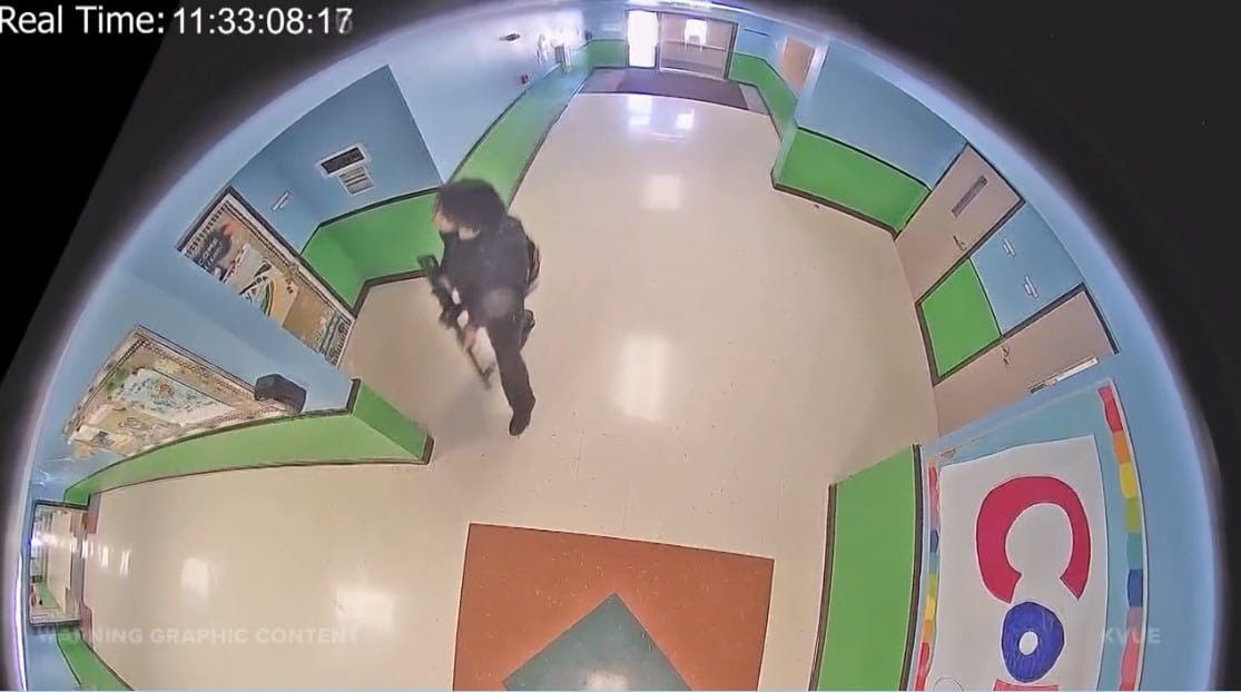 The second part of the video is an inside look of the school, which shows the suspect enter and walk down a hallway, ultimately going into a classroom. The video also shows the police response for an hour after the suspect initially walked inside.