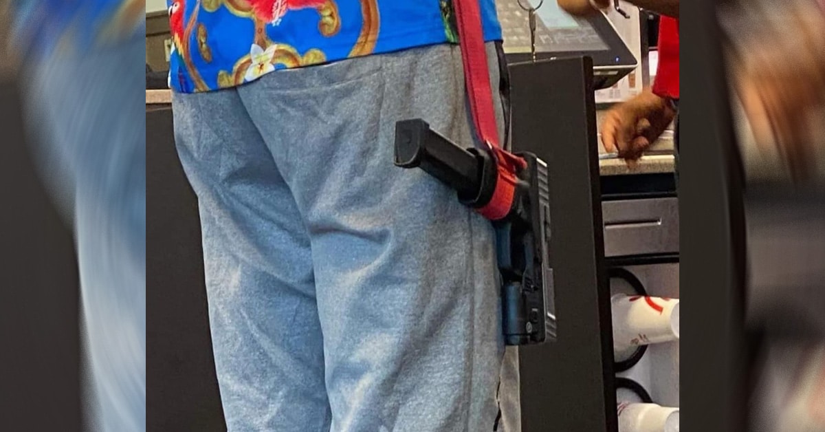 The photo, seemingly taken a few days ago in Baton Rouge, LA, is a scary thought to say the least. I’m not sure what the actual goals are here, but there are far better ways to openly carry a handgun.