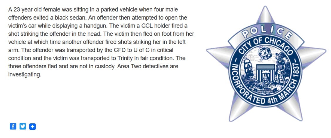 Police did not say how many shots she got off, but coincidentally, a man was found in a stolen black Kia just a few miles away not long after. He had been shot in the chest and died at the hospital, but the Chicago Police Department did not say if the two shootings were related. It will be interesting to find out if his fatal gunshot was from her firearm.