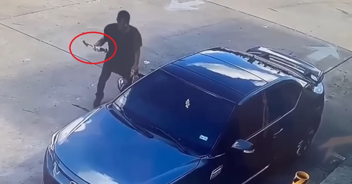 The occupant of the vehicle made a run for it through a door that kept the car between himself and the attacker, and bolted inside what appears to be a convenience store.