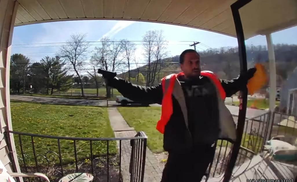 Luckily, the armed man decided to take off, but if his gun were real, could have easily done more. Being armed in this moment would have been a wise thing, especially if some dude in a vest that pulled up in a pickup truck is suddenly trying to get into your home.