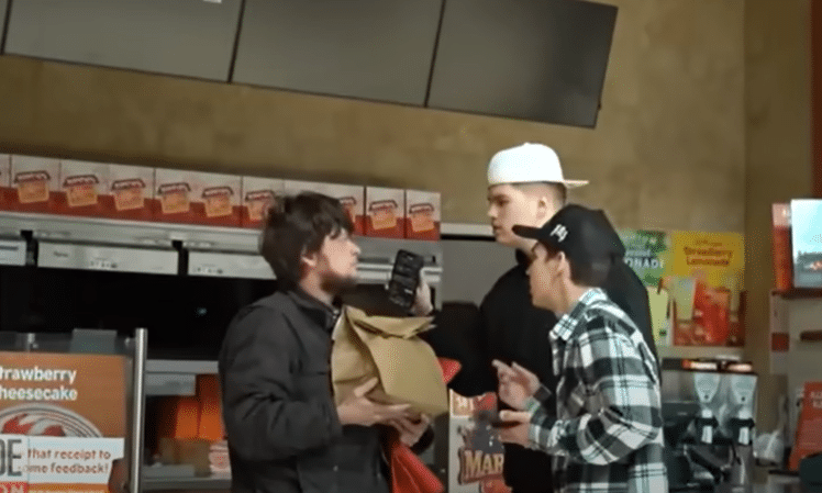 The YouTuber, Tanner Cook, is attempting to get a reaction from his random target, in this case Alan Colie. Cook continuously puts his phone in Colie’s face, with Colie pushing him away and telling him to stop multiple times. The larger Cook, along with a buddy, continue to follow and pester Colie, disregarding his demands that they leave him alone.